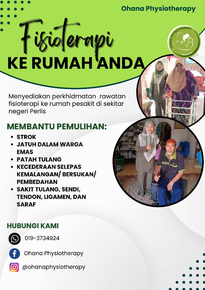 Rawatan fisioterapi ke rumah ialah rawatan fisioterapi yang diberikan kepada pesakit di rumahnya untuk pesakit yang terlantar, pergerakan terbatas mahupun pesakit yang tiada pengangkutan ke klinik. Rawatan yang diberikan juga merangkumi rawatan mesin, rawatan manual, sesi senaman dan lain-lain lagi seperti di klinik. Kami cover kawasan sekitar negeri Perlis sahaja. Sesuai buat pesakit strok, patah tulang, 𝘋𝘦𝘮𝘦𝘯𝘵𝘪𝘢 dan lain-lain lagi.