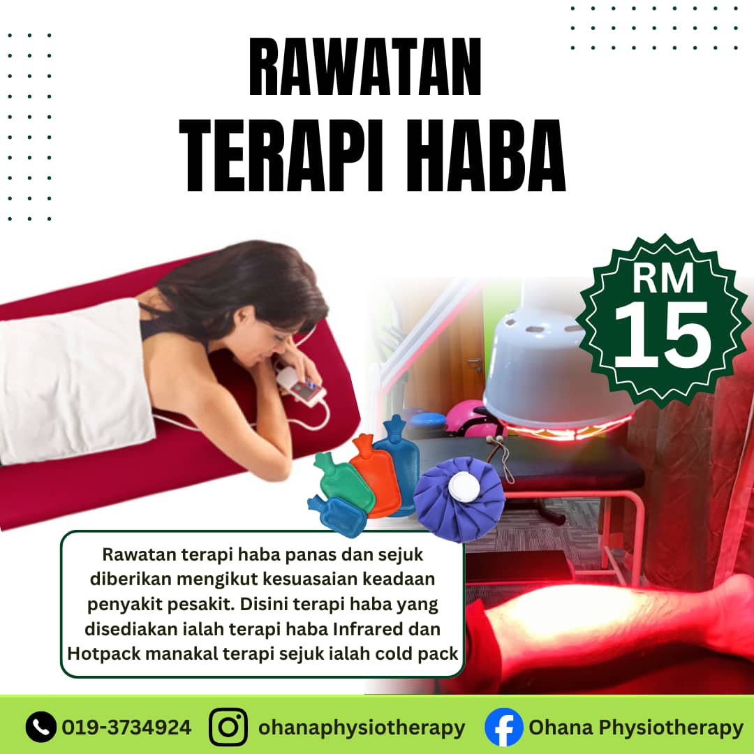 Terapi haba Rawatan terapi haba yang terdapat disini ialah terapi haba panas dan sejuk. Terapi haba panas terdiri daripada rawatan cahaya Infrared dan 𝘩𝘰𝘵𝘱𝘢𝘤𝘬 manakala terapi haba sejuk ialah menggunakan coldpack. Rawatan ini akan diberikan mengikut kesesuaian keadaan penyakit. Rawatan ini sesuai untuk merawat masalah bengkak sendi, lebam pada otot, sakit keradangan sendi, ketegangan otot dan urat simpul, dan membantu meningkatkan pengaliran darah di kawasan sakit.